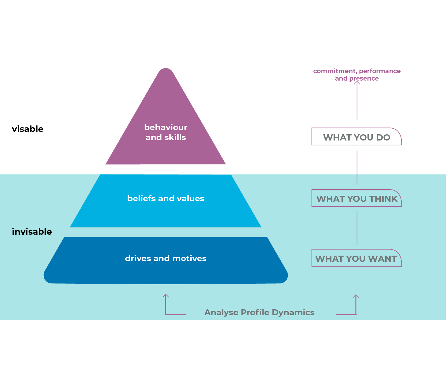 The iceberg model shows how your motivations and beliefs translate into visible behavior. Understanding drives contributes to self-knowledge, promotes mutual understanding and cooperation, and makes policy more effective.