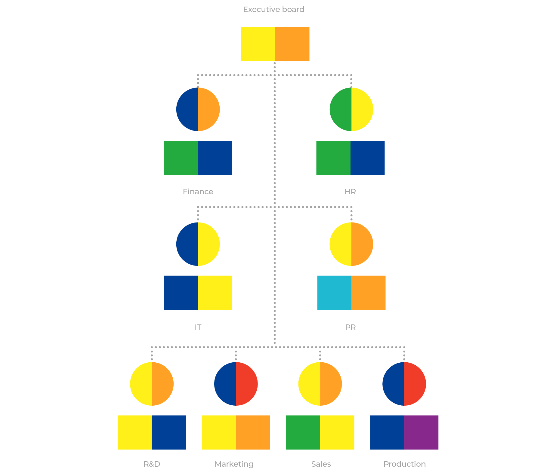 This organogram shows the motivators and cultures in the organizational departments and in key positions. At a glance, you can see how the cultures fit in with the work, how they are interrelated, and where the bottlenecks are.
