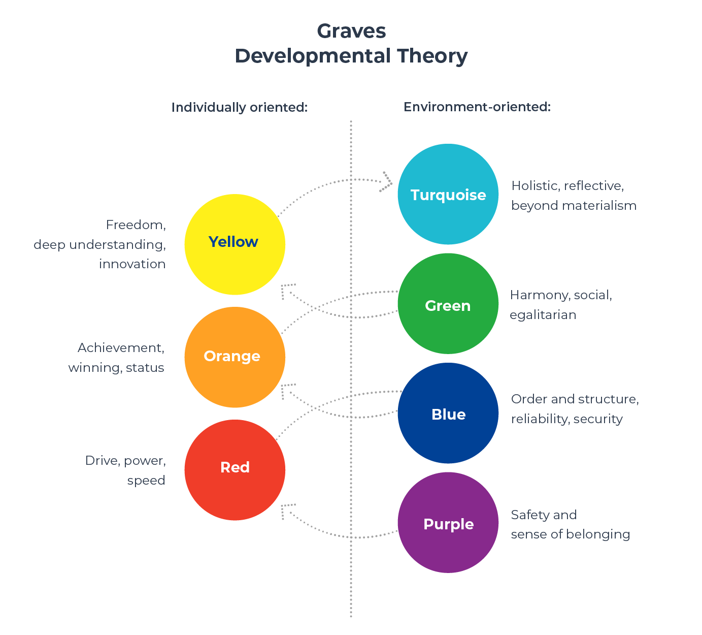 The spiral shows how people and cultures develop according to Graves' theory. This model forms the basis for Profile Dynamics motivators and motivator cultures.