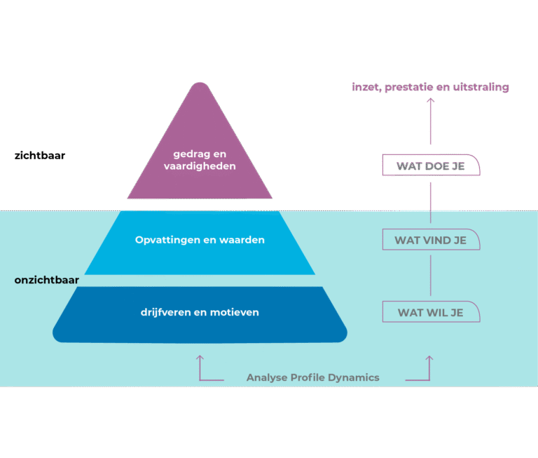 Het ijsbergmodel laat zien hoe jouw drijfveren en opvattingen zich vertalen naar zichtbaar gedrag. Inzicht in drijfveren draagt bij aan zelfkennis, bevordert het onderlinge begrip en de samenwerking en maakt beleid effectiever.