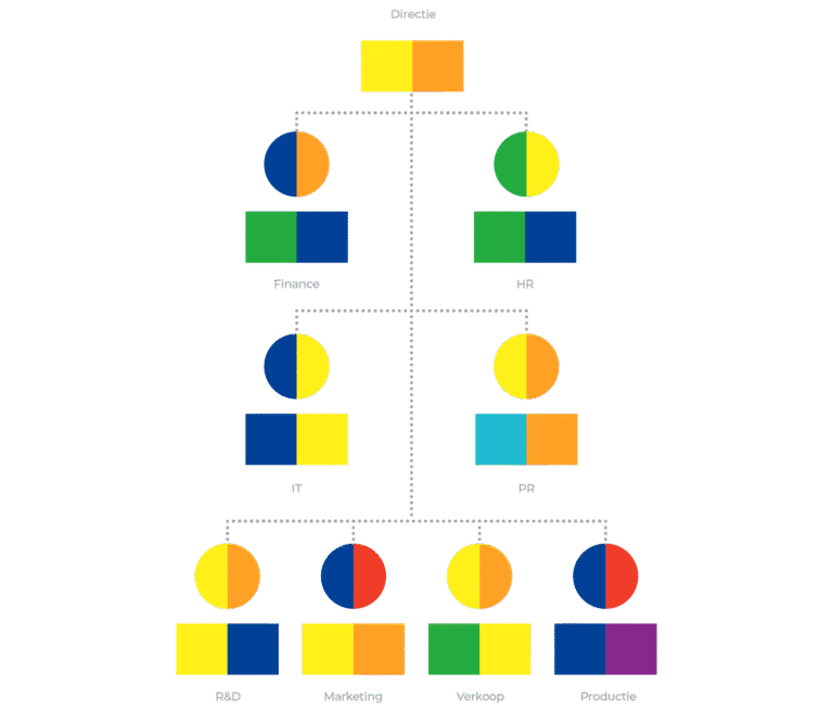 Dit organogram toont de drijfveren en -culturen in de organisatieafdelingen en op sleutelposities. In een oogopslag zie je hoe de culturen aansluiten bij de werkzaamheden, hoe de onderlinge samenhang is en waar knelpunten zitten.