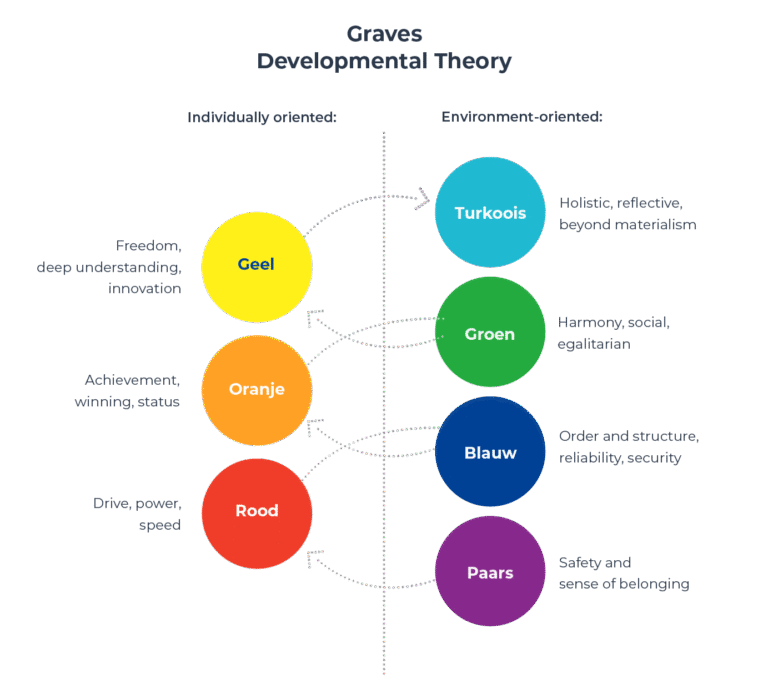 De spiraal laat zien hoe mensen en culturen zich ontwikkelen volgens de theorie van Graves. Dit model is de basis onder de Profile Dynamics drijfveren en drijfveerculturen.